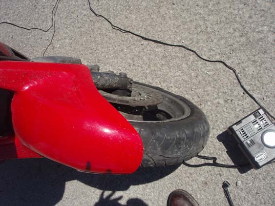 | As I make my way out of Newton, I feel the front end of the bike act a little squirrely. I think I must have hit a patch of diesel or something. But then the Lord sets off a warning in my head and I begin to get that uneasy feeling that I had yesterday. I start slowing down and then it happens - the front tire completely looses all air. Now if you have never had that happen, consider yourself very fortunate. On a motorcycle, it gets quite interesting when it does. I manage to come to an orderly stop and see what is going on. Since there is no shoulder for pulling over, I very slowly manage to get the bike to the next driveway. I always carry my tire stuff, so I sit Frost up on the center stand and break out my portable air compressor. | ||