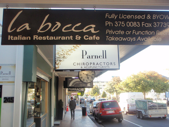 We decide on an early supper and early bedtime so we can hit the road before most of the traffic in the morning. Since at this point we have no clue as to what travel times will be like, we'll give ourselves plenty of time to get to our next point. After two days on airplanes, a walk into downtown Parnell for supper sounds like a winner. We take a survey down through the area and run into a gentleman standing in the doorway of a shop. I ask him, "Anywhere around here you'd recommend to eat"? "Yes, just up the street two blocks" he says, so off we head with a destination in mind. When we see this sign, it looks pretty good inside so we give it a whirl. |
