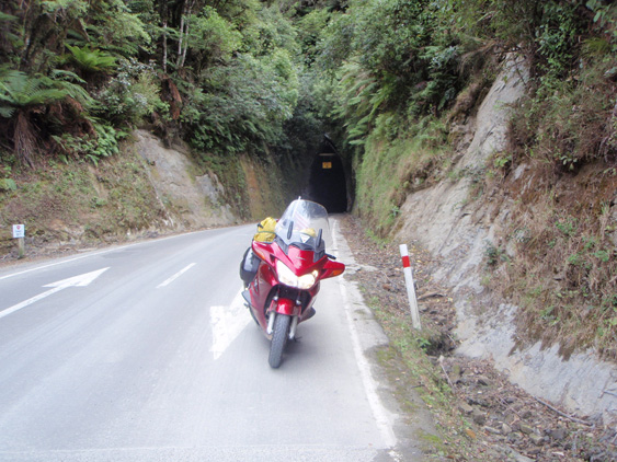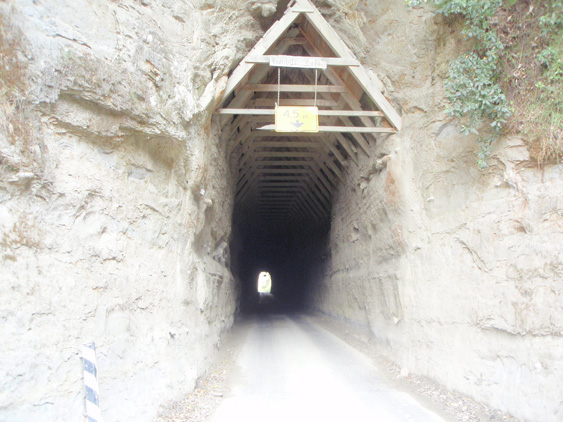 | Soon we come to the 'Hobbit Hole', also know as the Moki Tunnel. It is a single lane tunnel, about six hundred and fifty feet long, all shored up with wood not steel. | ||