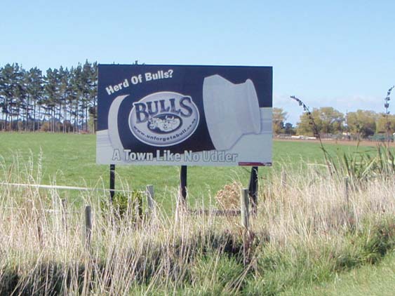 | Then we arrive at the town of Bulls. You have to admire a town with a sense of humor. It indeed is 'town like no udder'... | ||