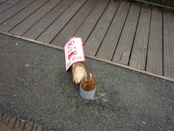| After we park the bikes and head toward the trail, I notice this sign. Seems like to me that the bus didn't ... | ||