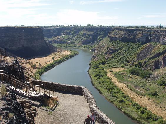 | Most of the 700 miles or so I need to cover today will be on I84, I15 and I70 until I get to Grand Junction. So I get an early start, hoping to reach Montrose, CO and hook up with Guy before sunset. I'll be running as long as I can today so I can minimize the gas stops. As fuel needle drops, I have to go hunting for fuel in Twin Falls, since it's a bit off the slab. I'm always curious if a town with the name falls in it actually has waterfalls. As it turns out Twin Falls has three falls close by - Twin Falls, Shoshone Falls, and Pillar Falls - all on the Snake River, but strangely enough Idaho Falls does not. | ||