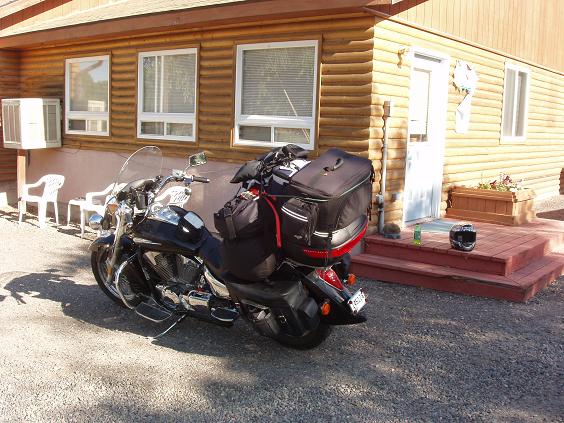 With that bit of business taken care of, I wander across the street to catch up with Guy and our visitor. There's a ditch and some tall grass, but I've got my boots on. I figure I'll just jump across it since it'll be quicker than walking up the road. That proves to be a big mistake for me. When I land, my feet slide in the mud I didn't see. I go down and catch myself with my left arm. I immediately feel the already torn ligament in my left elbow tear pretty badly. Guy and the visitor, whose name is Bill, come out to meet me and see the whole thing. I pick myself up and tell them - "Boy, that was pretty bad and I'm sure I'll pay for it later." They've already eaten, so I get something quick and we make small talk until I finish up. Once we get back to the cabin, Bill has a ton of questions about long distance touring. This is his first long trip and he's just come up from Texas on the heaviest loaded Yamaha cruiser I've seen in quite a while. |