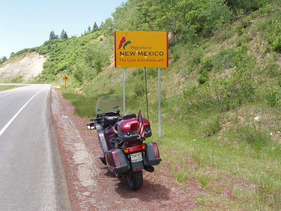 | As I walk in, I see a sign - "Hog's breath is better than no breath" I don't know as I agree with that, but it is a catchy slogan. The food's good and the service is good so I've got no complaints. Then it's back to the road killing at hand. Just past Pagosa Springs, I turn onto highway 84 that will take me into New Mexico and to highway 64. Since I'm right at the sign I decide I'll get another picture of SweetTreat at a stateline. | ||