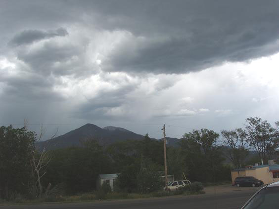 | A Connie rider soon joins me under the shelter and we strike up a conversation. "You're riding one of the best value deals in sport touring" I tell him. It turns out that he's school teacher from Austin, TX on a tight budget and has been camping and scrimping his way across New Mexico. He's having a big time and I'm all for him. "I don't know how you manage to teach in the current state of affairs without the ability to discipline." "Well, it is difficult but there are rewards. And besides I get three months off in the summer to do this" he says with a grin. The storm appears to be letting up, so I wish him a safe journey and head on into Taos proper. Bad choice - because then the bottom really drops out before I travel a half mile and I don't have on my rain gear. It's hotter than blazes and I just didn't want to put it on and bake in a bag. I'm soaking wet but I finally find another convenience store shelter to pull under. There's a HD rider and his girlfriend huddled under there also, waiting out the storm. I change what clothes that I can decently in public and break out my rainsuit. I tell them - "Don't worry about the rain. Just as soon as I get this rainsuit on and go about another mile or so it'll stop. So just wait a little while and you'll be okay. Trust me on that one." They smile and say "Thanks." I get all suited up, wave them good-bye then head out of Taos toward highway 518 in the downpour. And sure enough, before I get out of the city limits, the rain stops. But as I turn down 518, I can still see the storm in the distance. The lightening is jumping back and forth which is not very comforting since I'm way taller than any of the fence post around these parts. | ||
