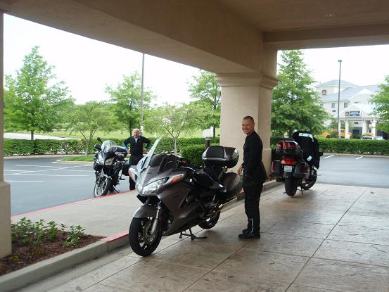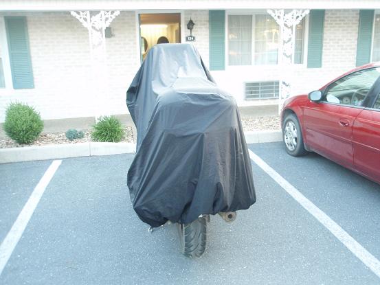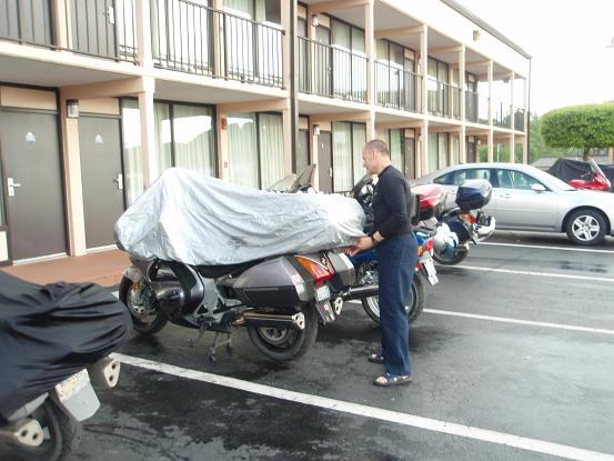 | There's a bit of a rain storm coming up, so Andy P covers up his ST1300 just to be safe. We decide that walking over to the Texas Steakhouse is just the ticket so we agree on a meeting time. | ||