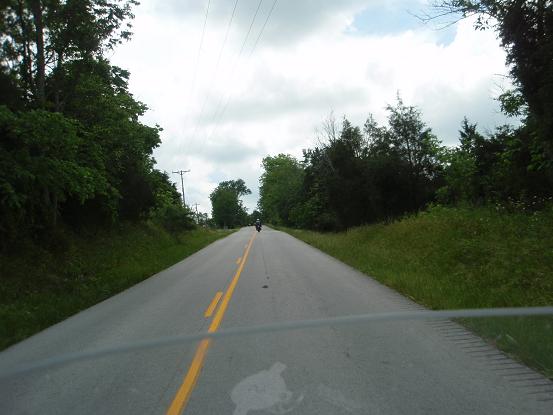Miss Holly comes out and I give her a big hug - "First time I met you and Jason you just got the news about having a youngin. Now you've got two." She's a really sweet lady (she has to be to put up with Jason) and it's great to see her again. But Jason's oldest boy, Clay, wants to 'ride' with the big boys, so we do an 'escort' ride around the block. With that business out of the way, Jason leads us for a tour of his stomping grounds. I fall into the tailgunner position and am able to get some good shots while we are rolling along. |
