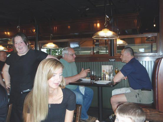 | We decide that we'll walk over to the Ruby Tuesdays for diner. Andy and I head up to the room to cool off for a while and wash the road crude off. Soon we head back out to hook up with the other folks and do the bum's rush on Ruby Tuesdays. Jason had warned them we were coming, but they didn't seem to prepared for us. Poor Ron and Andy P have to take a booth by themselves, but they seem to be doing all right from what I can see. | ||