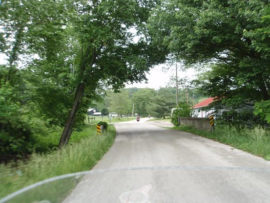 I tell them - "Well, my battery is deader than a hammer. A four way flasher relay hung open and drained the battery. I guess I'll have to find a place to get it charged before tomorrow." Bob, a local rider, who just showed up, says - "Well, I have a charger at my house I could bring over." "If you can bring an extension cord too I should be in business" I tell him.. So he dashes off and returns with the goods. I quickly finish up breakfast, settle up, and get to the task at hand. Bob and his friend, Brad, have offered to take a group of us on some local roads, which is always of interest to me. The local riders generally know some really good roads that don't show up on most folks' radar screens. As my battery charges, I talk to them about the drop and sweep method and we decide to try it since some of us don't have GPS systems. Again, I offer to be the sweep so with that settled, we wait until SweetTreat is good to go. When she springs to life, I get the bodywork back on and we pull out. The roads that Bob and Brad have chosen are great, with nice surface and long sweepers. Once again I am enjoying the view from the back of the pack. |