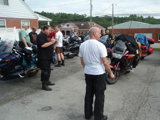 Since the rain really starts to pour down, I head for the tunnel, figuring it will at least be dry inside of it. Fortunately, the weather finally clears up and we make it into West Liberty to the house of Jason's in-laws. Jason's father-in-law's grandpa built this house in the early 40's and it's been in the family ever since. It's got a large parking lot so there's lots of room for everybody. I also get to meet Jason's dad and step mom who have come over to see what kind of fellers would ride with Jason. |