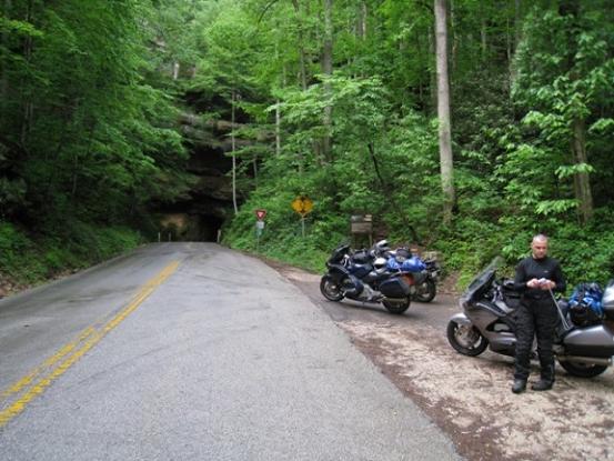 | With the roads a little slick, we have to be really careful as it rains off and on. As I round a right-hander, my heart races - Paul's VFR is facing my way and Paul is standing off on the side of the road. He barely touched the yellow line and did a slow speed low side. I block the road with my flashers on until he can get the VFR restarted and rolling again. We stop at a pull off at the top of the hill and do a check on him and the bike. Both are a little worse for the wear, but his AeroStich did the job it was supposed to do and he'll be fine. The VFR is rideable with a cracked saddlebag and little road rash but it will be fine too. We get back on the road and finally catch up with the rest of the group. Jason has stopped the group at an interesting local historical spot call the Nada Tunnel. | ||