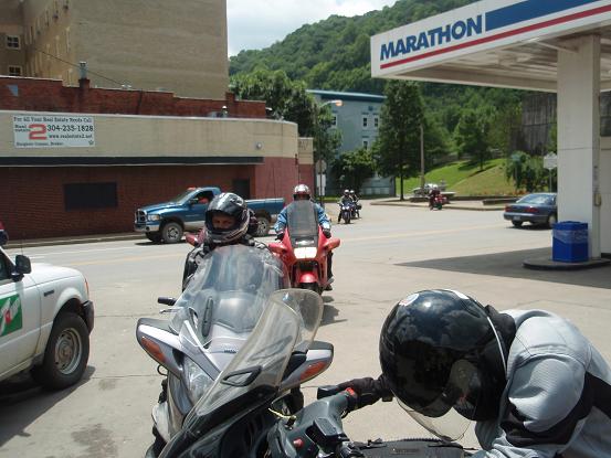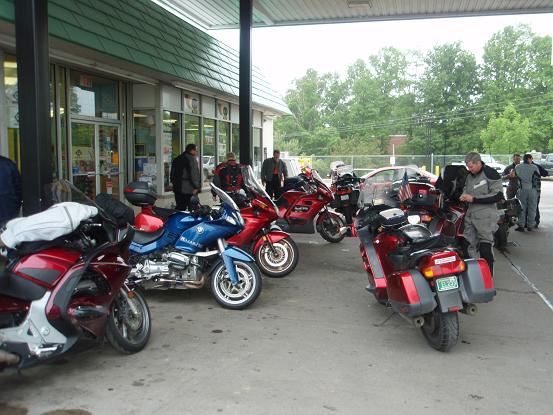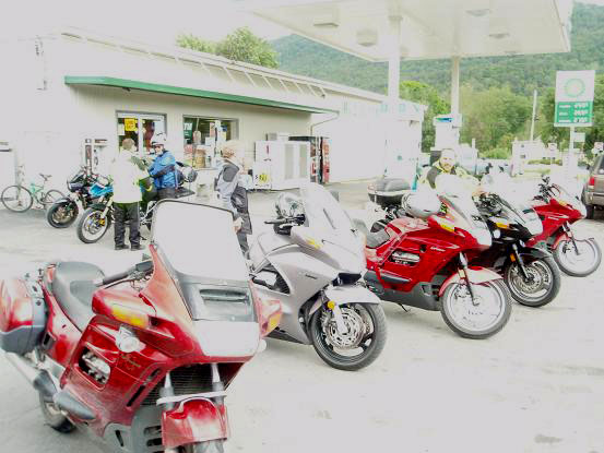 One of the challenges on a group ride is managing the fuel stops so that different bikes get what they need when they need. Though most of the bikes are STs, some are not and they don't have quite the range that the STs do with their 7 gallon tanks. |