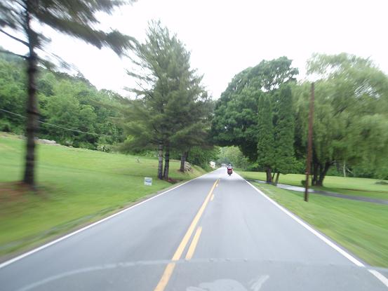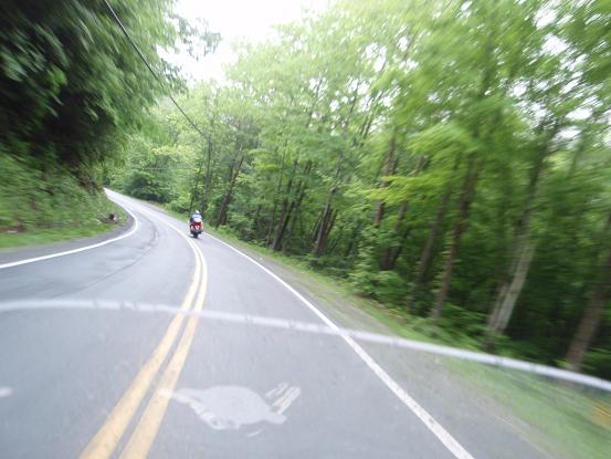 | Soon we're into the curvy bits and folks are extra careful with the moisture that still lingers on the road. One of the most dangerous times to ride is after a rain if it only rains enough for the oils in the pavement to float to the top instead of washing off. | ||