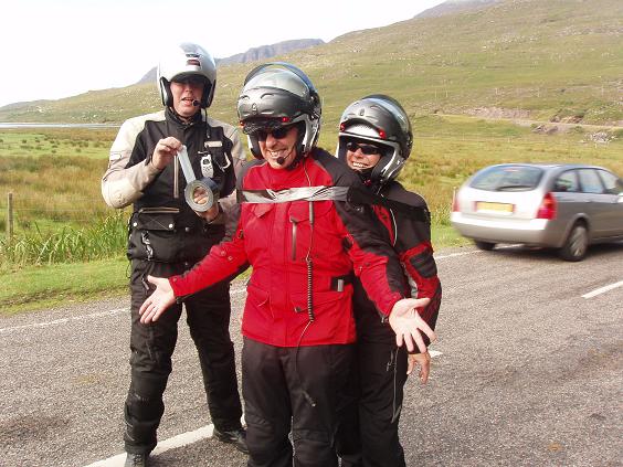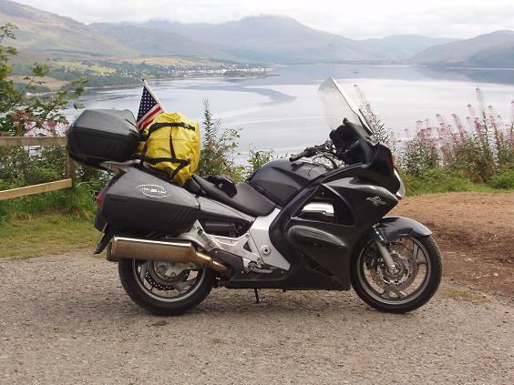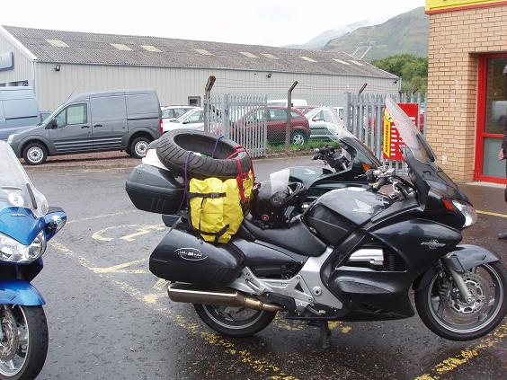 | Nearby where we are parked, there's a man playing the bagpipes. It is here that I learn of what Peter thinks of such musical efforts. "Nothing like a man in a skirt strangling a cat" he says. "Hmm, I've never thought of it that way" I tell him with a grin. As we take a break, Moff looks at Keith's back tire, which is just about flat. "Hey mate, I think you have a problem" he tells him. Not only is it very low, you can tell that he's been riding a while that way because it is just about slick. I tell him, "Don't worry, I've got a air pump in my bag. We can at least pump it back up." As I am pumping up his tire, Moff gets a good look at my rear tire also. "You are already down to the wear bars, Phil" he tells me. "If you get stopped for any reason and they see your rear tire, they will give you a safety violation ticket." Moff should know, since he is a policeman in Kent. And I know that over here, the tickets are very expensive and they take the road worthy condition of the vehicles very seriously. So this puts me in a bit of a dilemma. I am only halfway through my trip and have quite a few miles to go. I was a little concerned about the remaining tire life when I left About Town, knowing how I ride and how quickly I can wear out the tires on an ST1100. I also know from previous experience, that once a tire wears to a certain point, it gets into the softer compounds and wears away much quicker. It's late Friday and About Town is already closed. I've got to be at Troon to make the ferry across to Ireland Monday and there's no way I can make it back to London on this tire. And I figure the chances of road rescue service having a source of the tire I need is slim and none. I also know that Mike at About Town is a reasonable feller to work with, so I decide that I will see if I can find tires for the bike locally, to save Mike and me a lot of trouble. Keith also is in bad need of a rear tire, so Moff and Peter began to make calls to see if there are any to be had and if there a shop that will install them on a Saturday. They locate one rear tire at Fort Williams, a town we will be going through. They cannot mount it, but will be glad to reserve for us. Then they reach a Honda shop in Oban that has a front and rear in stock and is willing to bring in a technician to mount them for us on Saturday. I sigh a long breath and say - "Thanks folks. Without your help, I guess I'd be trying to limp back to London and forgetting the Ireland trip." So we mount up quickly, knowing that the tire shop in Fort Williams will be closing before too long. When we pull into the National Tyre Service, I am relieved that they are still open. I am also amazed that a 'regular' tire place would even carry motorcycle tires, much less one that fits an ST. If I was back in the States, I'm afraid I would probably have been just out of luck. As I bring back my treasure to the bike, Bob asks me - "Now just how are you going to carry it - wear it around your waist?" "Don't worry. I've strapped more things to an ST that most people could imagine". I am careful to pad every thing so that the BT020 tire does not wiggle and damage the paint on the top box. Before long, my ST1300 has a nice 'spare tire' secured to it, ready for the dash to Kinlochleven. | ||