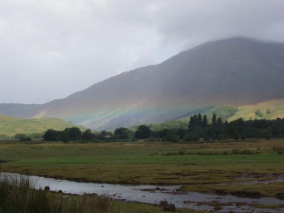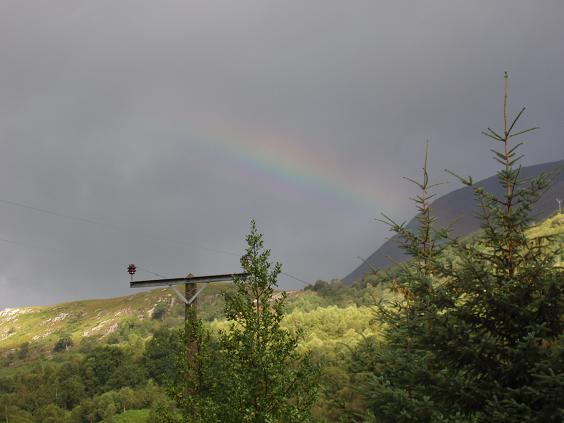 | Once we cross the Loch Linnhe, we hang a right through the village of Ardgour and north on a single track that shadows the northern part of the loch then heads west along the shore line of Loch Eil. And though the clouds come back in, there's another rainbow beaming across a valley that we are passing through on the way to Glenfinnan. | ||