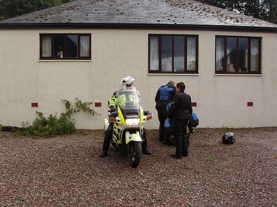 | For me it is also a time of quiet reflection, as many of the riders have to head back home and rejoin their 'normal' daily routine tomorrow. I know that my time is coming, but I still have the unseen sights of Ireland to contemplate and another day of riding in Scotland. Gareth, my roommate and fellow pork pie eater is on the road soon. As he leaves, I can't help but smile as he could pass for Guy in his Blue Aerostich as he pulls away on his ST1100. In honor of his departing, I have spirited away a pork pie for the somber occasion. I also just happen to have a little mayo, some cheese, a Diet Pepsi and a Snicker's bar. What a breakfast feast I have and with sound effects no less. My digestion is aided by the snoring of my remaining roommate Dave which vaguely resembles a steam shovel hard at work. The reverberations have little effect on my appetite, so I make short work of my provisions. Colin is the next one to bid us an adieu. Soon the SmartHound has it packed up and he is headed back to his 'kennel' in Wales. | ||
