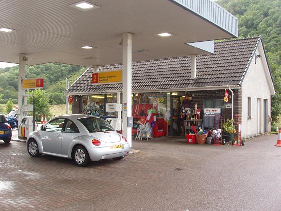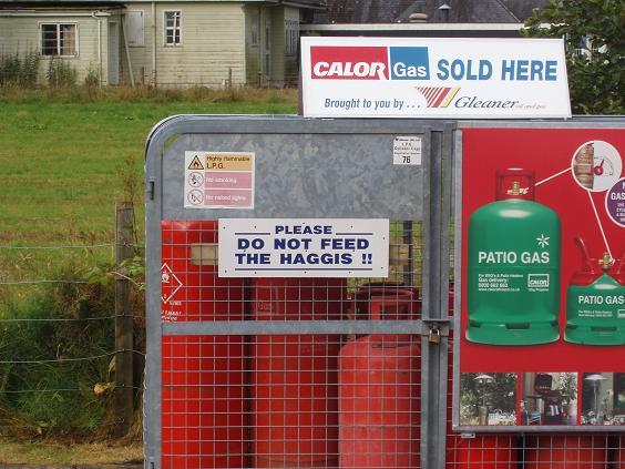 | It's sleepy sort of peaceful day, and those of us still around are in no hurry. Dave has a nice ride that will take us up to Mallaig on A830 road  the "Road to the Isles" - also known as "Rathad nan Eilean". It is a functioning sea port more than a tourist spot so it should be interesting. Then we will head back on some of the roads that we traveled in the past few days. At our first fuel stop, Bob points me to this gas display with a bit of caution, since I did eat haggis last night. | ||