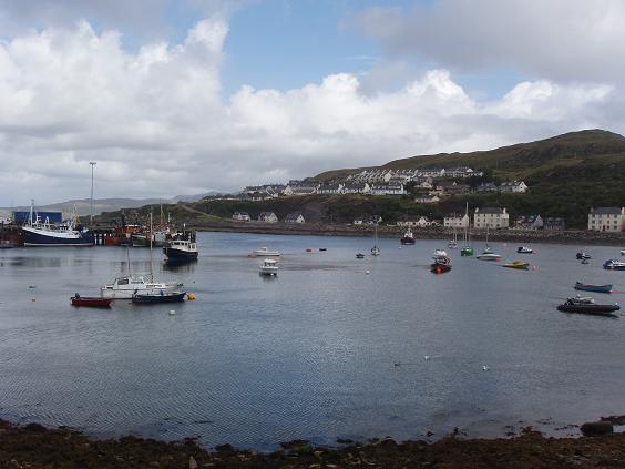 | The rain has left us once again as we reach the harbor of Mallaig. It is the official end of the "Road To The Isles", the termination of the West Highland Railway, and the jumping off point for many ferries that service the surrounding islands. It is also the home to many fisherman who daily ply their trade in the cold, surrounding waters. | ||