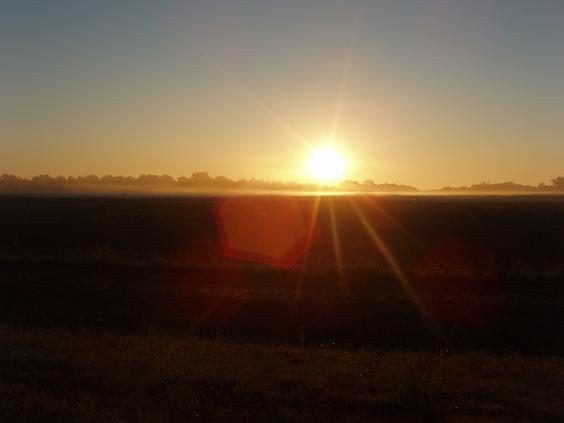 "Just remember - the Holler Hotel is always open for you" and I give him a big hug. Then we're off into our separate paths - me on the road and him off to work. Once again I have been blessed by a special person who has invited me into their life. As I head down highway 400 toward Wichita, I start thinking how strange it will be to celebrate my birthday evening by myself. But sometimes things just work out that way and you just play the cards in front of you. I realize that I must stay focused on the road, because the deer are still moving about. As I go along, I hit something in the road that just about jars the fillings out of my teeth. I think no more of it, but I've just bent my rim slightly and lost my right side reflector, bracket and the bolt that holds it together. (I'll discover this later on in the trip to my frustration.) Finally the sun peaks over the endless fields, which is a welcome sight to me. |