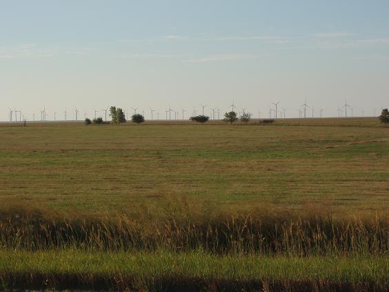 | Before long, I'm on highway 196 which will take me around the city and onto the slab. From there, it will be all slab the rest of the day. But when you've got to cover the miles, it's the only choice. I hit I135 and before long I've rounded the corner and I'm on I70 which will take me into Denver. I'm thankful that I have a comfortable seat and cruise control which makes mile-eating a lot easier. Distance riding is like any other endeavor - you've got to have the right equipment and right mindset before you start. Along the miles of flat countryside, I see a farm of electricity generating windmills. | ||