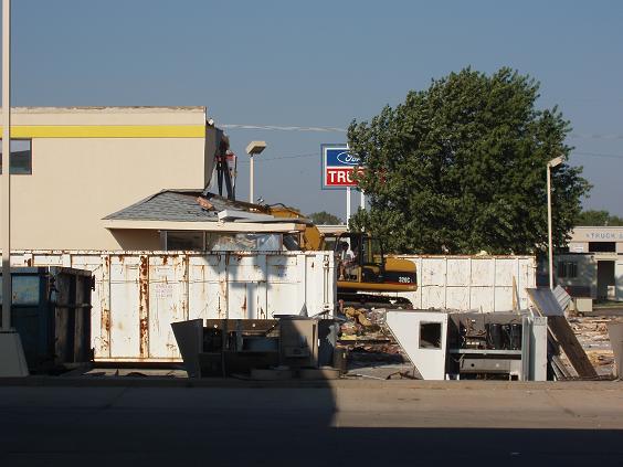 It's time to gas up again so I find one that looks easy to get on and off. When I am covering miles like this, I prefer a quick stop that is out in the country. You can usually get gas and get gone in a few minutes - just off the ramp, into the station and back on the ramp. But I'm a bit tired, so I find the first one I come to and take a little longer break. I decided on this trip I would bring my own snacks along so I picked up a large can of cashews (which I happen to like a lot) at Wal-Mart and divided them up into snaplock bags for easy packing. Cashews are highly prized in most quick stops judging by the price, so I figured this way I could enjoy them without paying a premium. As I rest a bit, I notice the McDonalds next door is being 'eaten' by a demolition excavator. It seems sort of ironic that a place that has 'eaten' so many folks wallets should suffer a similar fate. |