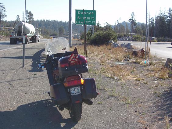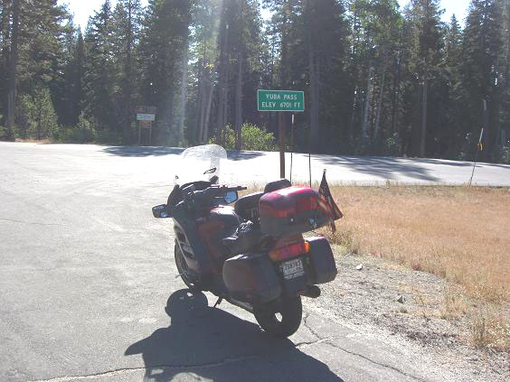 | But shortly after the sign, the road turns into a horrible, rutted, washed out mess. Do I continue on for 20 miles and have my guts shaken out or do I turn around? Knowing the bolt is missing from my front fender, I can see it cracking under the vibration - which could create a real problem. Such is the vulgarity of the unknown road - some days you play 'em some days you fold 'em. So today I fold my hand on this route and decide to head back the way I came. But this is not going to be easy on the ST - the road is up hill, it's canted uphill, it's single lane and there's no turnaround in sight. One miscalculation and the SweetTreat and I are going to be rolling down the ridge side. Today is a day that I'm glad my legs are long and strong as I gently nurse the bike up the camber and back, rocking her gently like a sleeping baby. Finally SweetTreat's nose and my nose are headed back down the hill. But the trouble doesn't end here - the exit I got off on does not have a western ramp so I have to head east on the slab. Finally after 2 east only ramps, I find one that I can get off and head back west. So much for a quick start to a long day! I figure that if change my plans and do Donner Pass first which is on the Interstate, I can double back and head for Yuba and be done with the slab for the day. So Donner is the first pass I snag. I decide that at each pass I will ride over the pass, turn around and get pictures of the pass signs from both sides. | ||