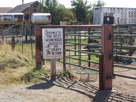 | My stomach has begun to telegraph my brain, asking if my throat has been cut. I know time is short but I also know I need to feed the beast. As I get back on the flats and approach Sierraville, I see this little sign near a barnyard. | ||