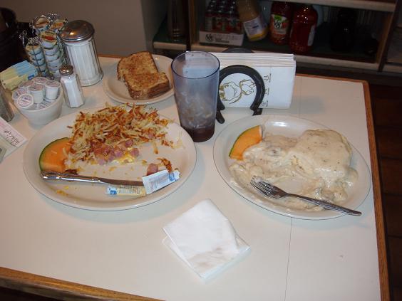 It's sort of crowded so I find a spot at the end of the counter and flop myself down. A sweet lady hands me a menu and I order - "Ma'am, I'd like a ham and cheese omelet and an order of your gravy and biscuits I saw about on a sign up the road." She looks at me like I'd lost what little mind I had, and she said "Are you sure?" "Well, is there something here I'm missing?" I ask her. "How about I bring you a half order since you're getting an omelet" she offers. "Well, I defer to your judgment and that'll be just fine." When the plates arrive, I am dumbfounded. I've never seen so much food in my life and it looks mighty good. She just smiles and leaves me to my eating. I eat and eat til I almost pop, and finally give up. Here's what was left after I ate till I could eat no more! |