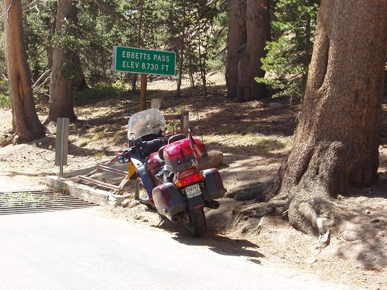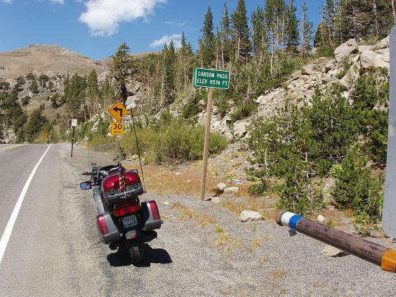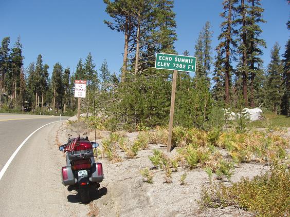 As I get south of the lake, there's a service station handy, so I fill up SweetTreat. I don't know how available fuel will be as I chase the rest of the passes but this tank will get me through a lot of them. I decide to take a quick coke and peanuts break and I notice a old, orange VW bug with Tennessee license plate filling up also. He sees my Tennessee plate and comes over. "I'm from Tennessee too"' he says with a grin. "But I've got a house here and there." "Well, I'm just passing through today, running the passes. This is some kind of beautiful place around here." "Yes, beautiful and expensive!" he adds. "Well, have a great ride out here and be careful." "Thanks a bunch!" I tell him "And you be careful too." I realize daylight is a burning, so I mount back up and come to an old familiar intersection - highway 50 and highway 89. Back in 2002 when I was running highway 50 to Dodge City I was coming from the opposite direction. It's funny how I have a hard time remembering people's names, but I generally don't forget a road. I stay on highway 50 and arrive at Echo Pass quickly. I find it sort of odd that it is labeled Echo Summit instead of pass, but it'll do. |