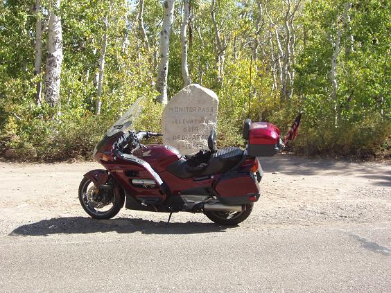 Most of the passes are marked with green type highway signs, so I keep my eyes peeled for the one for Monitor Pass. I see some bicyclists pulled off on the side, but I whizz on by. I think to myself "I ought to be close now, but I sure don't see no sign." I had been going up, but now I'm headed down the hill. Sometimes it will fool you, but this seems a continual decline. Then it hits me - I bet those bicyclists were pulled off at the pass sign. I do a quick U-turn and head back. Sure enough, Monitor Pass is only marked with a stone obelisk, not a green highway sign. | ||