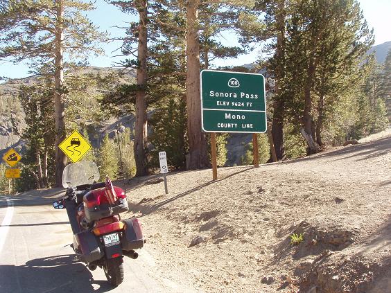 | My mental calculations tell me I've got about 140 more miles to go. If I stay after it and push a little bit, I should be able to make Tioga just before sundown. Before long, I reach the turnoff to highway 108 and Sonora Pass. I make as good a speed as I can, but carefully so. Again, this is not the place to go stupid, and I am so close to making my dream of hitting all the major Sierra Passes in one day. The ride is enjoyable and SweetTreat is doing what she does best - eat the miles and hang the twisties. I finally reach the summit and once again have it all to my self. I remember the last time I was here there was snow on the ground and we pelted Bamarider with snowballs as he looked around. I head down the other side a bit and then make my way back up to get the other sign shot. Just as I mount up, what seems like 1000 Harleys and their Japanese riders pull up coming from the opposite direction. I've never seen so many bikes in such a tight spot before. They're all decked out in leathers, some of the bikes have apehangers - quite an interesting group. I'm just glad I'm headed the opposite direction, which I do very quickly! | ||