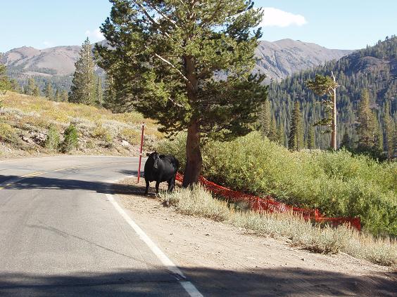 | As I work my way back down highway 108, I run up on a herd of free range cattle. Understanding the slickness of their green byproduct and their propensity to dump it wherever they like, I put on the binders and proceed cautiously. This one does not seem to be happy that I am interloping into his space, so I bid him a fond adieu and head on down the mountain. | ||