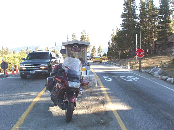 The sun is getting lower in the sky, and I've still got Tioga left to reach. This one will be a bit tougher to get a picture of since the only pass sign is on front of the ranger gate hut. As I arrive, I pull out my National Park Card, and my best hillbilly grin as I address the ranger on duty - "You reckon it would be okay if I just pulled my motorcycle in front of your shack here for a little bit, so I could get a picture?" I asked him. "I'm all the way from Tennessee and it sure would be nice if it'd be okay with you." Much to my relief, he replies - "Sure thing, we're not that busy right now." I thank him profusely, and maneuver the SweetTreat into position. |