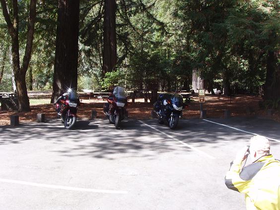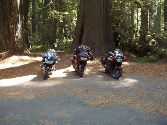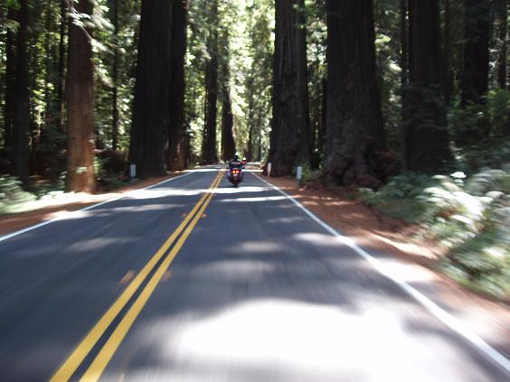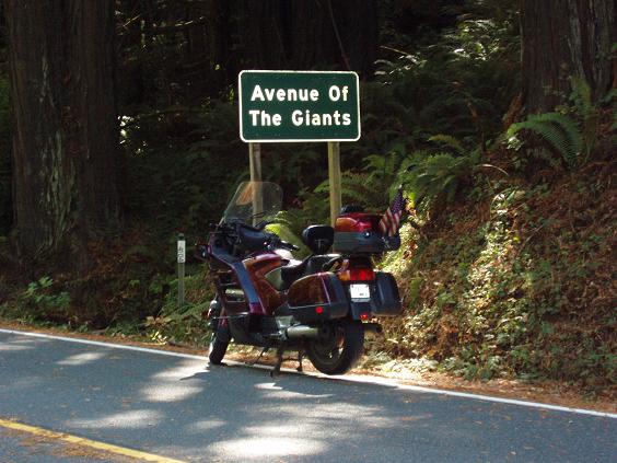 | Before we saddle up, Rich tells us - "There's another special place I want to take you on the Avenue of the Giants. I think you will like it a lot." "I'm just following you, my friend" I tell him. So we're back at it and soon turn left off highway 36 onto highway 101. This is the road that will take us to the Avenue of the Giants, technically known as highway 254. To me, the Avenue of the Giants is a special place where the giant trees hovering over the road give you a feeling that you have entered into one of God's great natural cathedrals. The Redbird has been here and I have a picture of her at the sign, so I stop for a moment to give the SweetTreat equal treatment. | ||