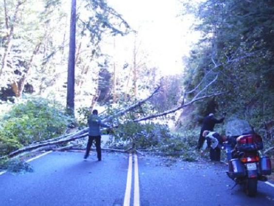 | I pick up a pretty bracelet for my lovely wife while I am there, and Rich selects some more redwood stuff for his house. With the mission accomplished, we're back at it and soon we are at Leggett. Here we come to the road I've been waiting for - Highway 1. This is probably the most scenic road that I have ever been on and once again I am delighted for the opportunity to ride it again. But before we can ride very far, we come to a major road block. A sizable tree has fallen across the road and there is this poor lady on a Harley staring forlornly at it. I realize that we are losing daylight, so I just tell her, "Excuse me ma'am, but if you'll just move back a bit, I'll see what I can do." I test the branches and fortunately they will break if enough effort is applied. So I figure we'll do this like eating an elephant - one bite at a time. I jump in like my pants are on fire, knowing that adrenaline will help speed the process. | ||