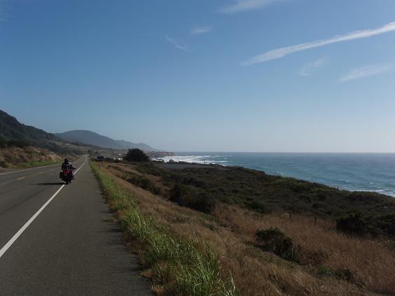 | When the folks behind us in the cars see what's happening, they begin to join in. We finally get it down to one major limb. This stuff is really springy, so I tell the fellers "Watch it now, when this thing breaks, we're all going to go a flying." We keep pushing, pushing, pushing - then there's a snap like a gunshot. And just as I predicted, we fall all over the place. One man is about to go tumbling down the hill, but I grab him by the heel and put the old death grip on him. He thanks me profusely "Man, that was close" he says. "No problem. I'm glad to do it and I sure am glad for the help." With roadway cleared, we suit back up and are on our way again. The most difficult part of riding highway 1 is not the technical stuff but the scenic stuff. Many places do not have guard rails, so if you're looking when you should be driving, it can be a long way to the bottom - and it's awful hard not to look! | ||