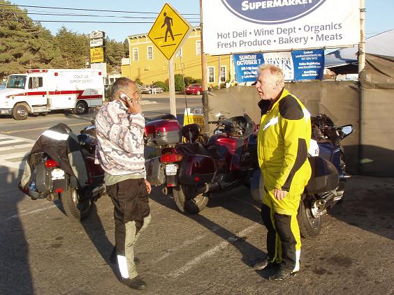 | Time is slowly slipping away and so is the fuel, so we make a gas stop in Gualala. V.J. calls Miss Mo, his lovely bride, to let her know where we are and the estimated arrival time. Little does he know of the chain of events that will greet us a little further down the road. | ||