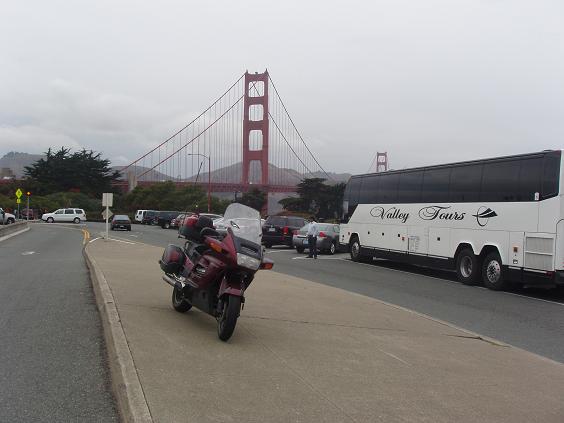 V.J. has been talking about taking some longer trips earlier, so I tell him – “Why don't you go sit on my ST so you can see what that Russell seat and the highway wings feel like.” He does and as he settles in, it's not long until a big smile appears across on his face. “This is really nice” he says and I can see his mental wheels clicking. But it's time to go for both of us, so I give him a big hug and tell him – “You and Miss Mo have got to come to Tennessee so I can show you where the good roads are. ” We both laugh, then mount up and go our separate ways. He and Miss Mo have been a real special blessing to me and again I am thankful for their many kindnesses. As I make my way down toward highway 1, my thoughts turn to the day ahead. I haven't ridden the section of highway 1 from San Francisco to where I will be getting on it. And I really wanted to get a picture of the SweetTreat at the Golden Gate Bridge like I did for the RedBird. And I've only got me to please today and a Motel 6 room waiting for me at the end. I know the morning traffic going into the city will probably be crazy, but then it sure can't be any worse that riding in London's morning traffic. By the time I get to highway 1, the right turn toward San Francisco instead of a left turn to SLO is a given. The closer I get to the city, the heavier the traffic becomes. But with a watchful eye and a quick throttle hand I just keep moving along. I just hope that my memory is correct where the park pull off is and I can get there in one piece. Soon enough I see the familiar outline of the bridge and work my way quickly to the park off ramp. Unfortunately, the park traffic pattern has changed a lot since the last time I was here and where I wanted to park is not an option. With no other choice, I just jump the SweetTreat up on the sidewalk where I think I can get a shot of her with the bridge in the background - and not get run over! |