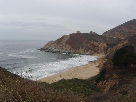 | With that bit of business out of the way, I figure out how to get back south to Highway 1 where I came from. The traffic is just as crazy going out as it is coming in, but a feller just does what he has to do. Before long I've escaped the city traffic and find myself enjoying the coastal view again. I pass by a strange looking house contraption perched on a high cliff and decide I've got to get shot of it. I finally find a place I can somewhat safely pull off and take the picture. | ||