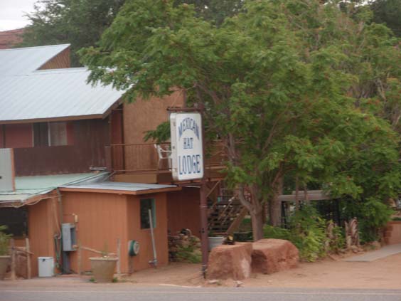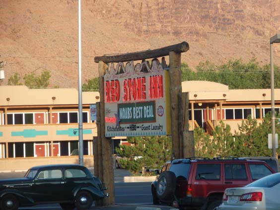 | But fortunately, we are neither struck by the lightning nor do I run out of gas and for this we are thankful. Soon we arrive back in Moab at the Red Stone Inn where we will be spending the evening. The young lady that is checking us in seems to be a bit confused for some reason. I can only assume it is the rugged handsomeness of the three travelers before her. When we get our keys, it turns out that she did get our rooms mixed up. But all we had to do was swap keys and move our stuff, so no harm, no foul. | ||