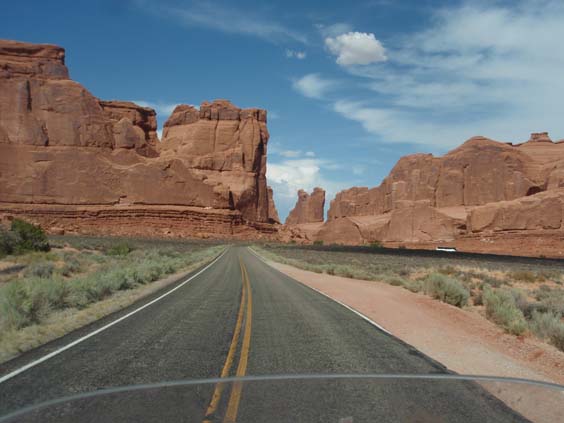 | The Arches National Park is just north of Moab, so I make a mental note of location of motel we will be staying in and we proceed directly to the front entrance. Once again, our park passes are our key to the wonders inside. | ||
