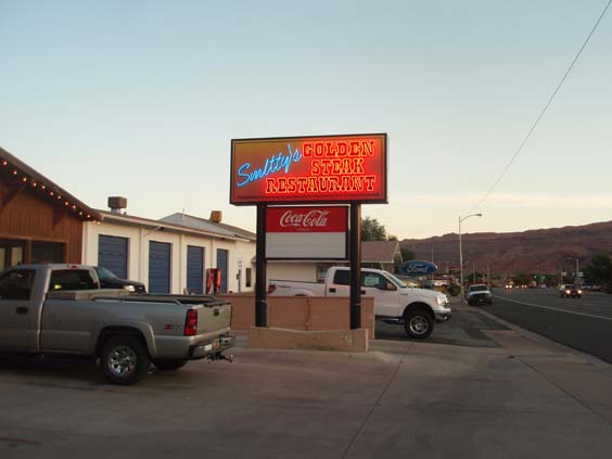 | We have been on the road for a while, so I search my memory banks for breakfast in Page. I spent the night here several years ago when I was exploring the canyons. I remember a Denny's as we come into town and it is still open and in operation. So it wins our business this damp morning. | ||