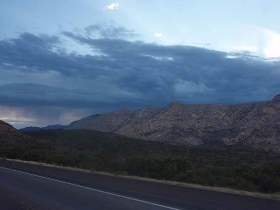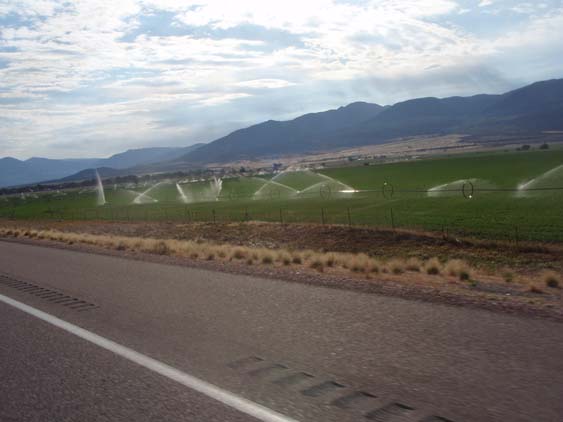 | The ever changing terrain in Utah does break up the monotony of covering lots of miles on the interstate. Here in one view you get the green hills, the dry hills, the desert floor and a mountain. | ||