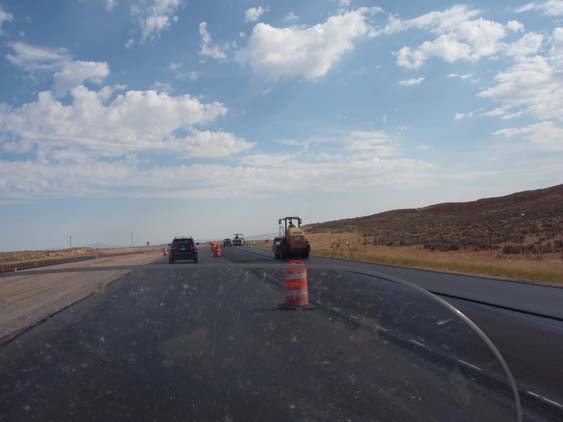 | I come to the Idaho state line, but it is right at the edge of an active construction zone. I peer behind me and there is a big road grader bearing down on me with no apparent intentions of stopping. I manage to get the pictures that I want and escape before I become intermixed with another pile of gravel. | ||