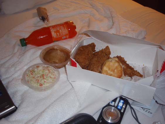 | With chicken in bag, I manage to get to my Super 8 room where I turn up the air conditioning to just short of cold enough to hang meat. | ||